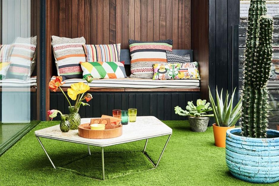 On your balcony, use artificial grass to simulate the appearance of a lawn. You can afford to spend more money on top quality, really lifelike turf when you have a little area to cover. Before placing, make sure your balcony's surface is level and has adequate drainage. You can also lay a patch like a rug that can be rolled up when not in use, but make sure the surface is flat and has sufficient drainage. Add colorful seat cushions and pots to the miniature oasis to enhance it.